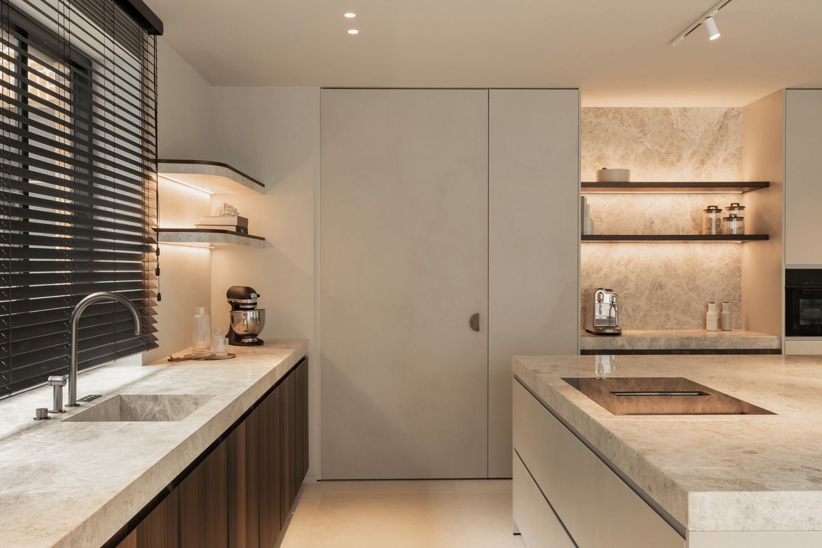 Keuken, badkamer, douche en maatwerkmeubilair werden volledig in natuursteen uitgewerkt. De kracht van dit project zit in de afwerking: aansluitingen die kloppen, overgangen die vanzelfsprekend aanvoelen en details die niet om aandacht vragen, maar ze wel verdienen.
